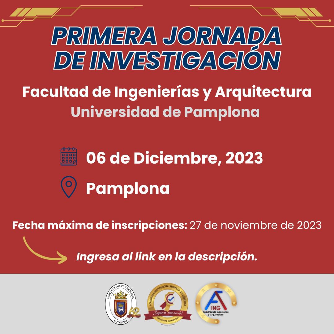 📌El 6 de diciembre de 2023 se estará llevando a cabo la primera jornada de investigación de la Facultad de Ingenierías y Arquitectura en la sede Principal de la Universidad de Pamplona.