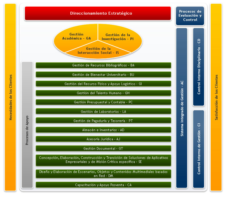Control Interno Disciplinario Control Interno Sistema Integrado de Gestión Gestión de la Investigación Gestión Académica Contenidos Multimediales basados en red Soluciones de Aplicativos Empresariales Capacitación y apoyo posventa Gestión Documental Adquisición de Bienes y Servicios Gestión del Talento Humano Gestión de Laboratorios Gestión de Bienestar Universitario Asesoría Jurídica Gestión de Pagaduría y Tesorería Gestión del Recurso Físico y Apoyo Logístico Gestión Presupuestal y Contable Gestión de Recursos Bibliográficos Gestión de la Interacción Social Direccionamiento Estratégico