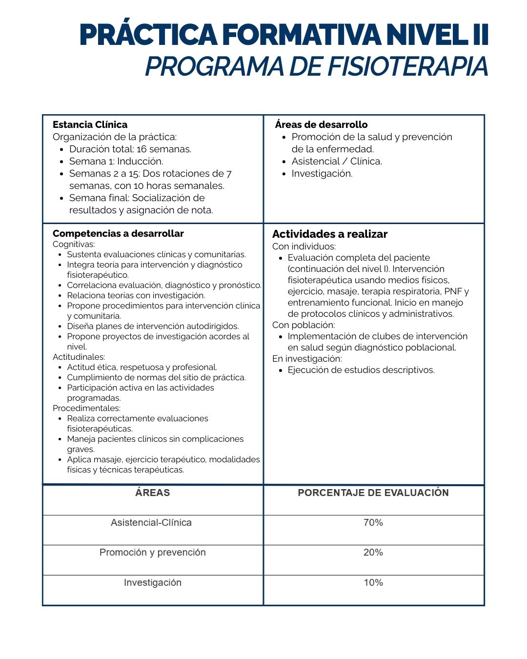 Desarrollar las capacidades y habilidades necesarias para permitir al estudiante hacer una completa evaluación, trazar objetivos y proponer plan de tratamiento basado en modalidades físicas, ejercicio terapéutico, terapia respiratoria así como participar en programas de prevención dirigidos a la comunidad.