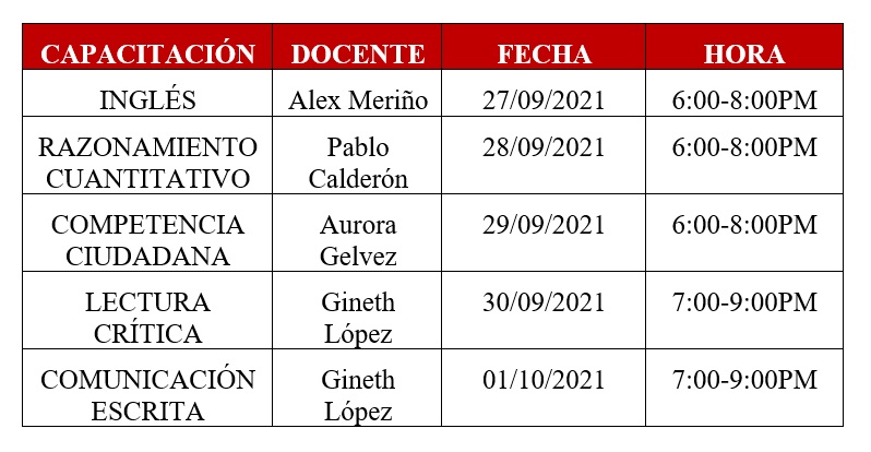En el siguiente cuadro, se resumen cada una de las competencias, con los respectivos Docentes, fecha y hora del evento.