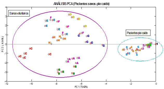 Una vez que la información relevante del conjunto de datos se obtiene a través FFT, se aplica el algoritmo PCA. La fig. 13. muestra el resultado de un análisis inicial de las señales de los pacientes voluntarios sanos (elipse línea sólida) y cinco con lesión (elipse línea discontinua).