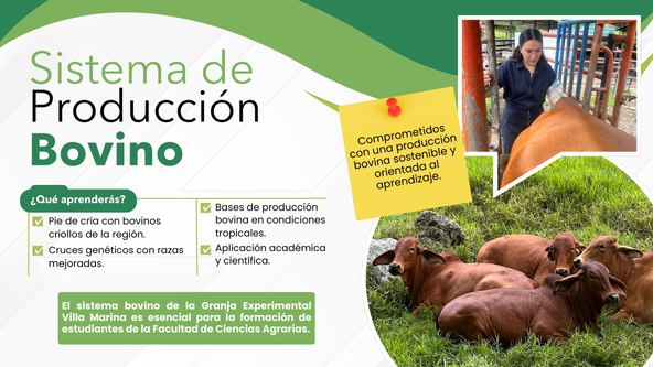 Este sistema se ha consolidado como un componente esencial para los procesos académicos de la Facultad de Ciencias Agrarias, ya que permite a los estudiantes desarrollar prácticas de campo y actividades de aprendizaje aplicadas. Gracias a la diversidad genética presente en el hato y a las condiciones reales de manejo, el espacio se convierte en un escenario ideal para la formulación y ejecución de trabajos de investigación. De esta manera, la producción bovina de Villa Marina no solo contribuye a la generación de conocimientos, sino también al fortalecimiento de competencias relacionadas con la producción ganadera en contextos tropicales.