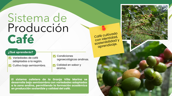 La Granja Experimental Villa Marina dispone de lotes de café establecidos bajo un sistema de semisombra, conformados por las variedades Típica, Tabí, Colombia y Castillo, en asocio con especies forestales. Estos cultivos se encuentran adaptados a las condiciones de relieve y suelos propios de la zona andina, lo que permite generar un ambiente adecuado para el desarrollo del cafeto y la expresión de características diferenciadas en sabor y aroma. Este sistema productivo constituye un espacio clave para el aprendizaje académico y la comprensión de prácticas cafetaleras sostenibles.