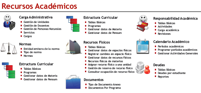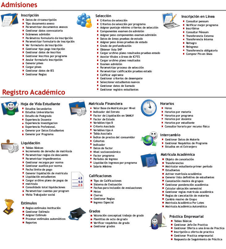 Apoya los procesos académicos de las Instituciones de Educación Superior desde el instante en que el aspirante expresa sus deseos de ingresar a la Universidad, la admisión como estudiante de la misma, como también todos los procesos académicos internos de cada institución, que se ajustan a la normatividad y autonomía de cada entidad educativa hasta la obtención del título como profesional.