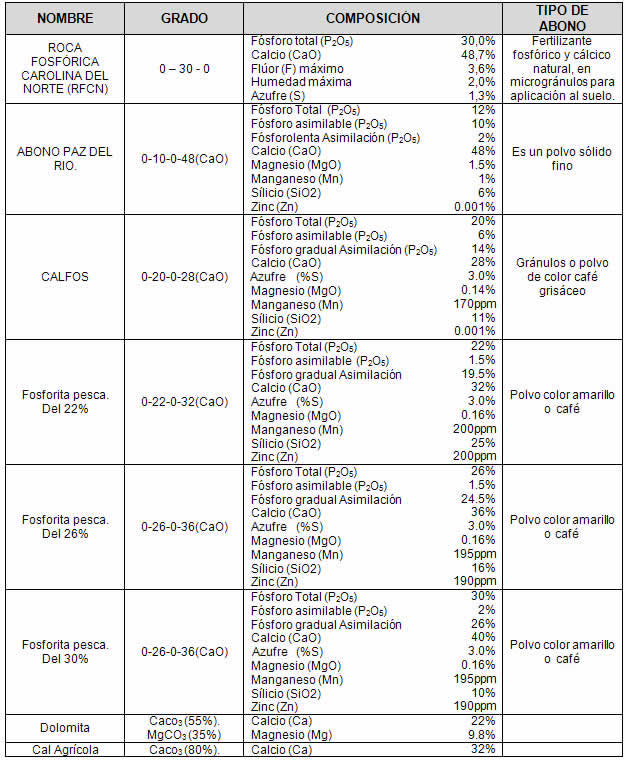 A continuación se presenta una tabla con algunos de los productos más empleados como enmiendas para el suelo.