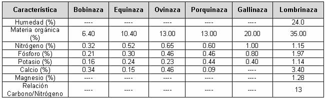 "Los abonos orgánicos más empleados como acondicionadores de suelo son: los residuos de las cosechas, los estiércoles de los animales, el compost, el lombricompost, los abonos verdes, los abonos líquidos, los biofertilizantes. En la siguiente tabla se presentan las características de varios tipos de estiércol y la lombrinaza a base de estiércol de bovinos como productos acondicionadores de suelo.