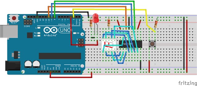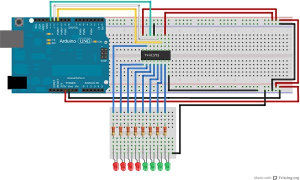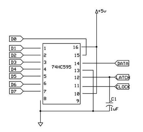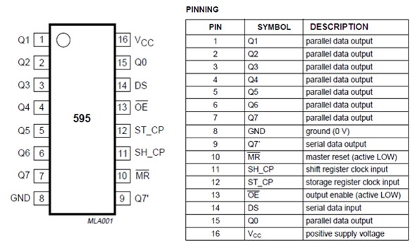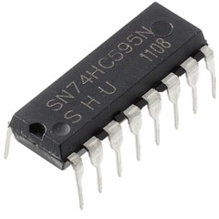El 74HC595 es un registro de desplazamiento de 8 bit con una entrada serie (3 pines Latch/Clock/Data) y salida paralelo (8 salidas digitales), puede encadenarse varios chips, con un segundo chip se obtiene 16 salidas paralelas simultáneas con 2 bytes, y así sucesivamente. SISO, SIPO, PISO Y PIPO. Registros con entrada serie y salida serie (SISO); Registros con entrada serie y salida paralela (SIPO); Registros con entrada paralelo y salida serie (PISO); Registro de entrada y salida en paralelo (PIPO)